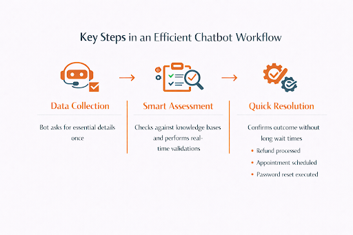 In a well-designed workflow, the process starts with data collection. The bot asks for only the details it truly needs—and it asks for them once, not repeatedly. It then compares the issue against existing knowledge bases, policies, and past cases to see what has worked before in similar situations. Wherever possible, it performs real-time checks, such as validating an order, confirming an account detail, or testing a configuration.