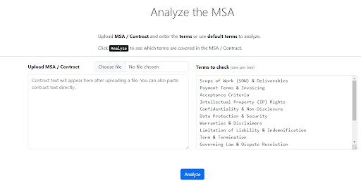 The MSA (Master Service Agreement) Checker reviews and analyzes contract terms and legal clauses. It helps identify risks, compliance issues, and negotiation points, ensuring that proposed terms are in the organization’s best interest.